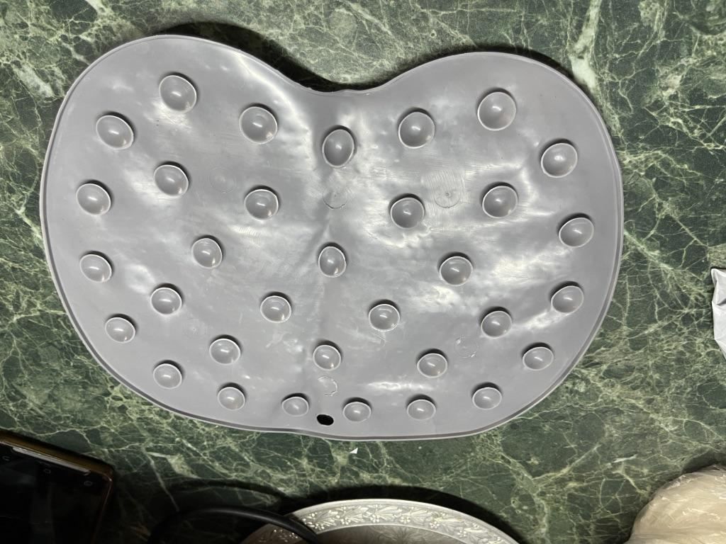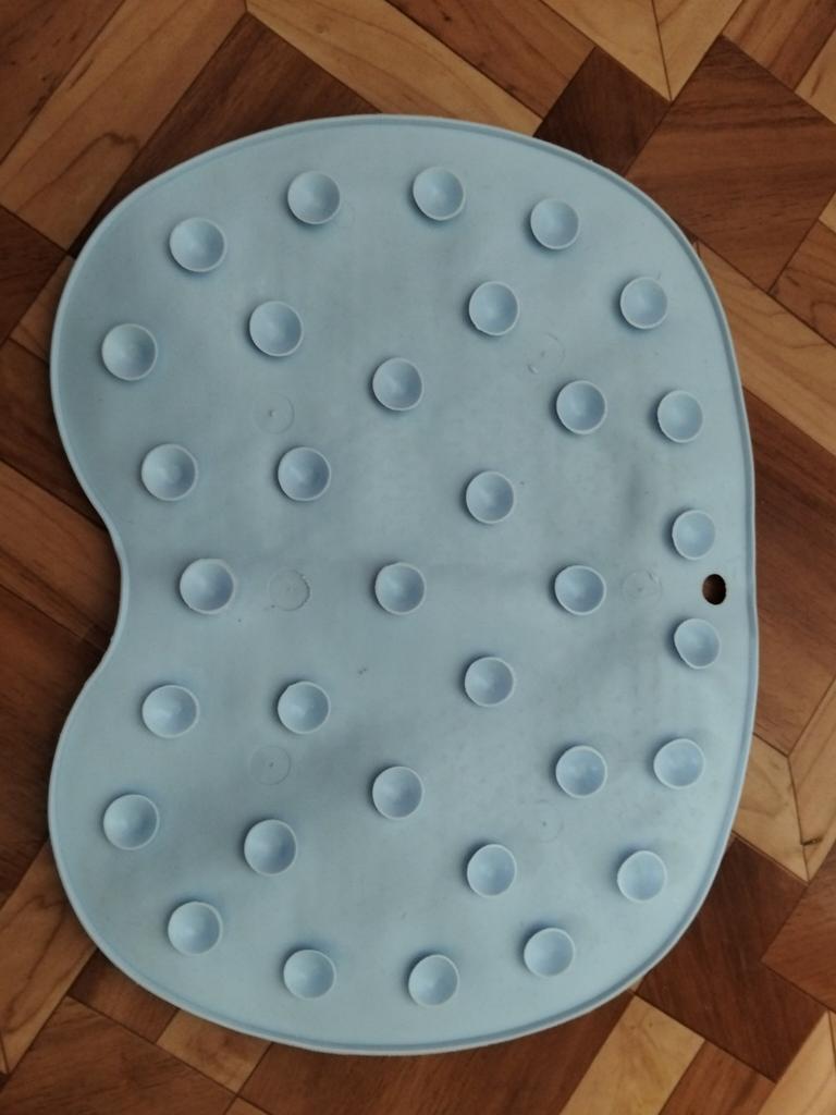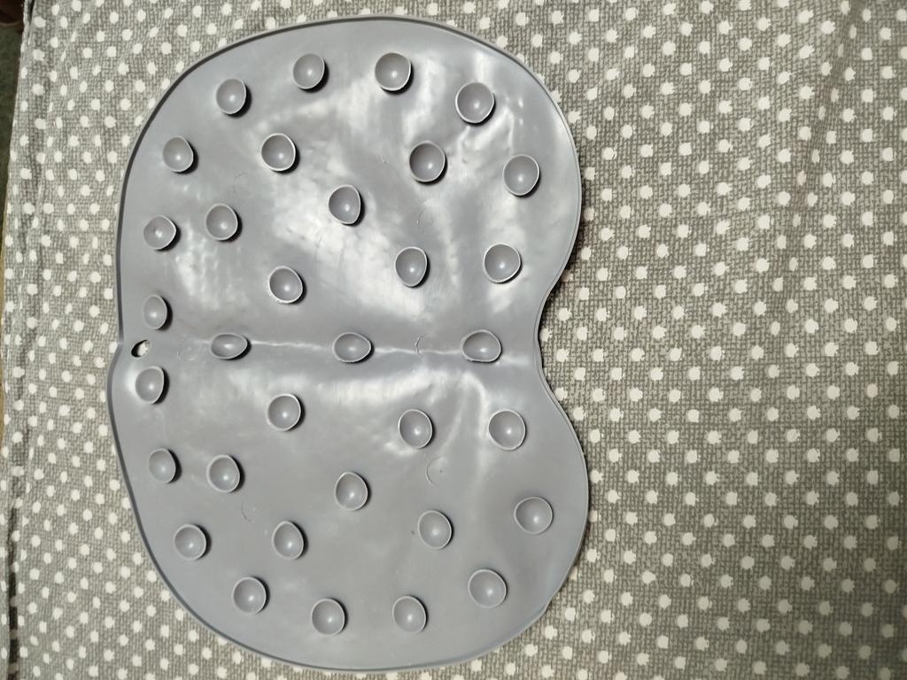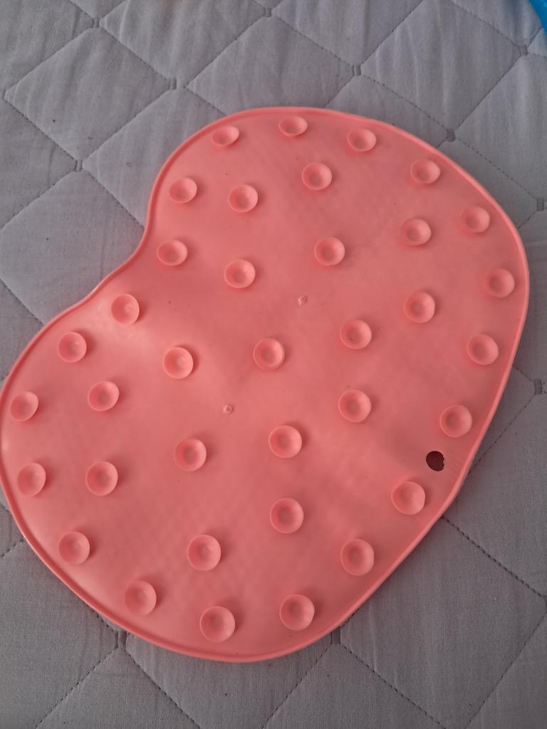 Very small, but otherwise comfortable, adheres well to the bottom of the bathtub.
