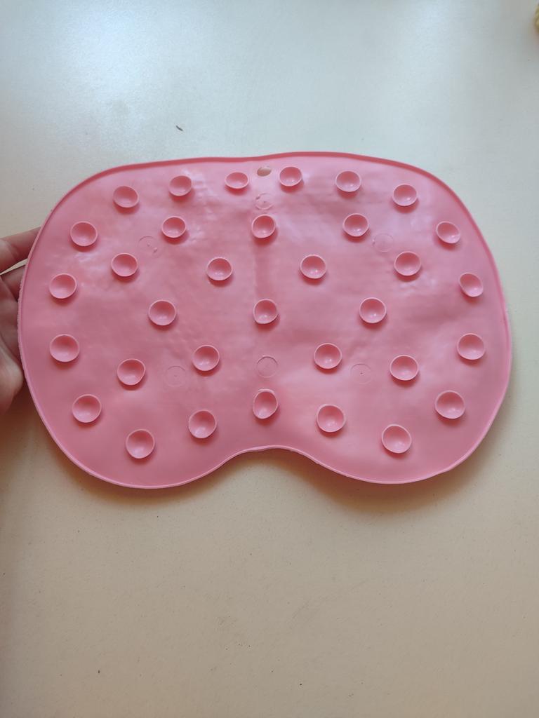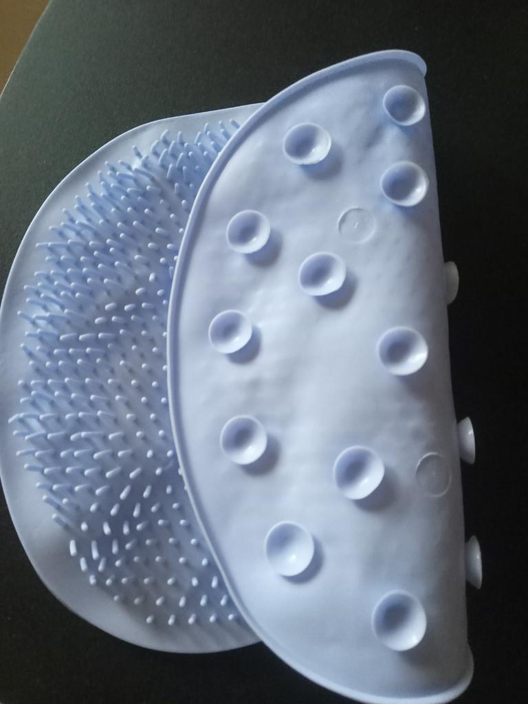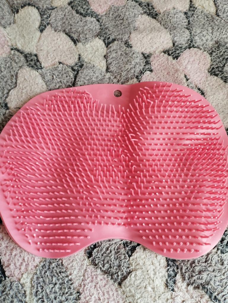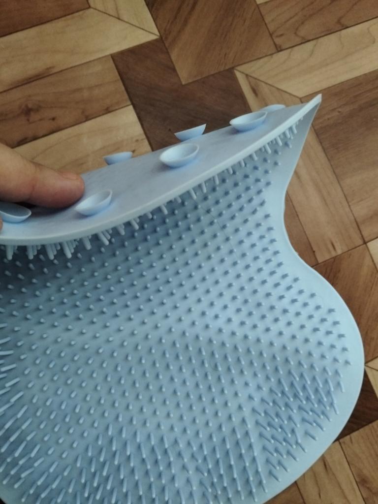Smaller than I expected. But for the money - it's okay. With suction cups on the inside. Very soft. I like it. Cleans the soles of the feet well.