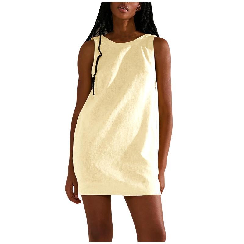 Summer Women's Cotton Linen Comfortable Solid Colour Sleeveless Backless Pocket Dresses