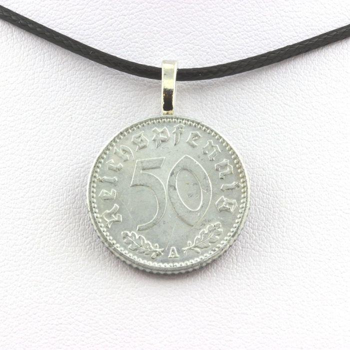 Pierres et Minéraux. Collier pièce d'Allemagne 50 reichspfennig Cordon noir.