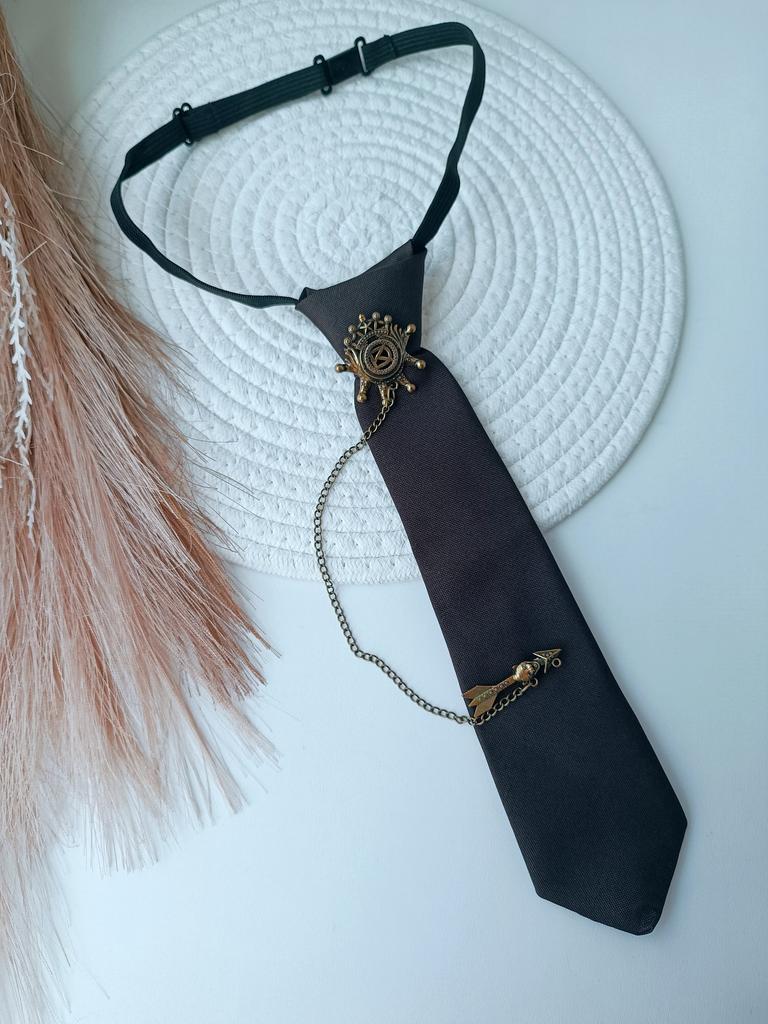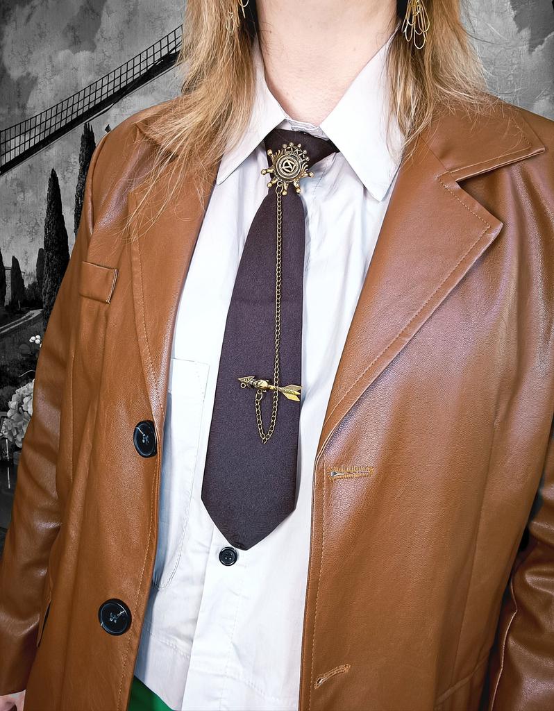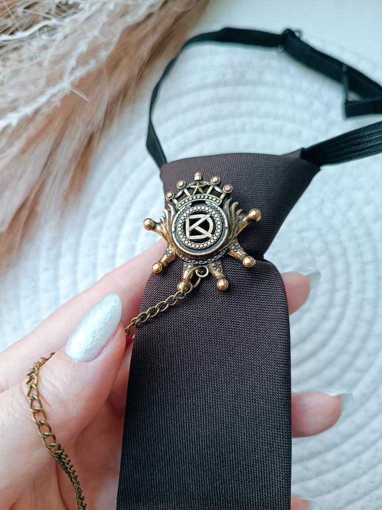 Stylish tie on elastic band👍 Such a retro tie looks very interesting! A convenient ready-made option, a tie that doesn't need to be tied. Suit fabric. Two brooches are attached with pins, connected by a chain. Brooches are metal in a bronze color. Cool, under a shirt, jacket. I highly recommend it👍🧡👍
