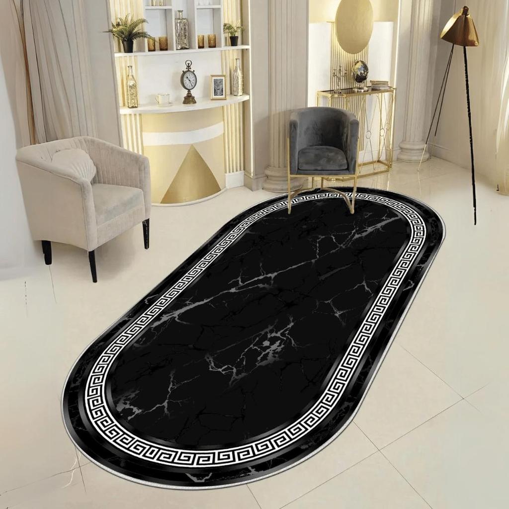 Embellished with a black pattern, black Greek key motif and a glossy white border, this oval rug offers an elegant aesthetic, adding a touch of luxury and sophistication to interiors.