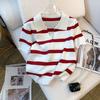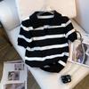 Summer New Style Ins Design Striped V-neck Short-sleeved T-shirt Ice Silk Knitted Top Women