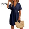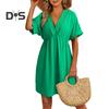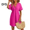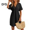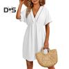 Women Summer Dress V Neck Short Sleeves Pleated High Waist Beach Coverup Loose Mini Dress Lace-up Tassel Strap Backless Slit Hem Dress