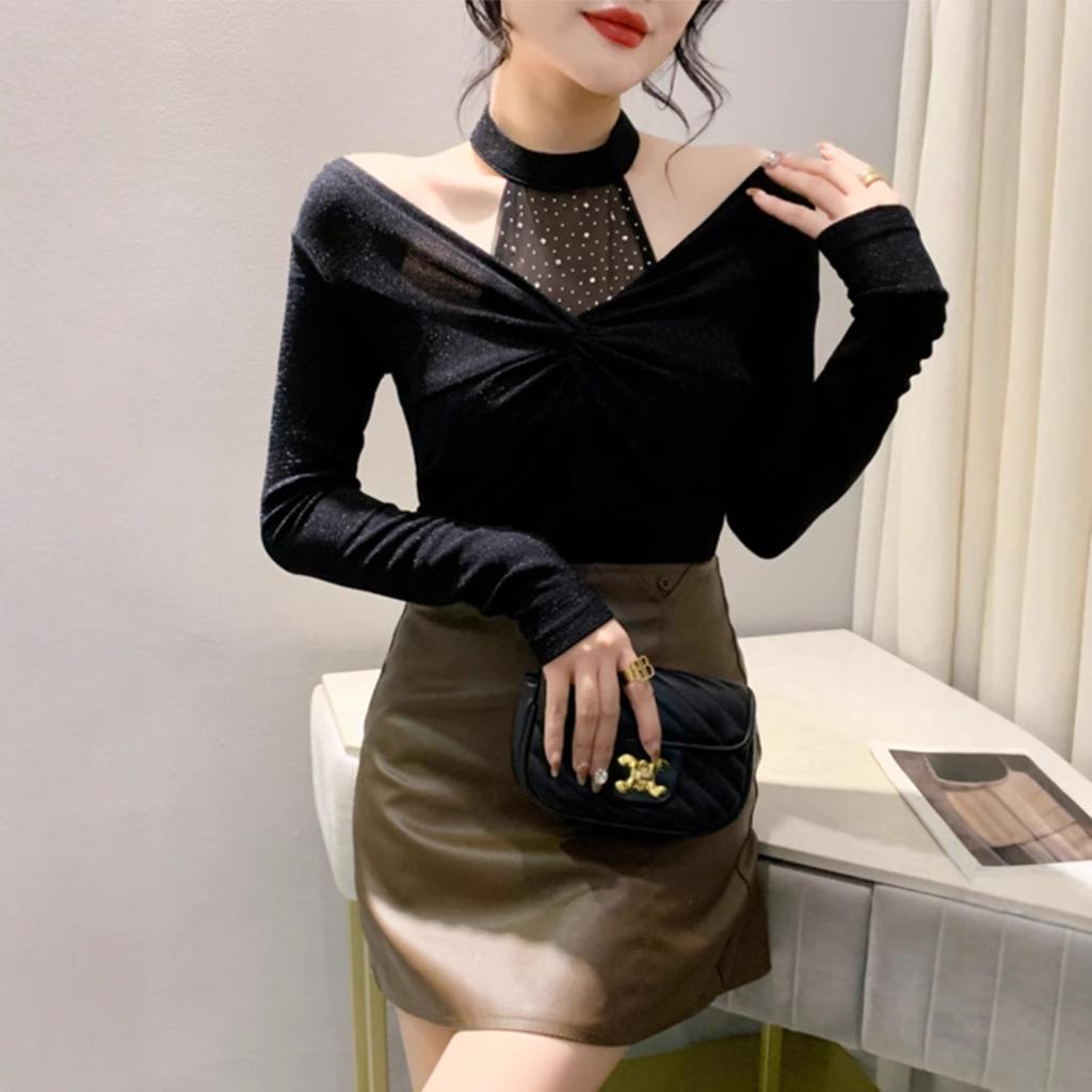 Hollow Off-the-shoulder Bottoming Shirt Women's Splicing Kink Slim-fitting Long-sleeved T-shirt Top