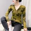 Beaded Pleated Base Shirt for Women Long-sleeved Winter V-neck Printed Top Slim Fit Mesh T-shirt