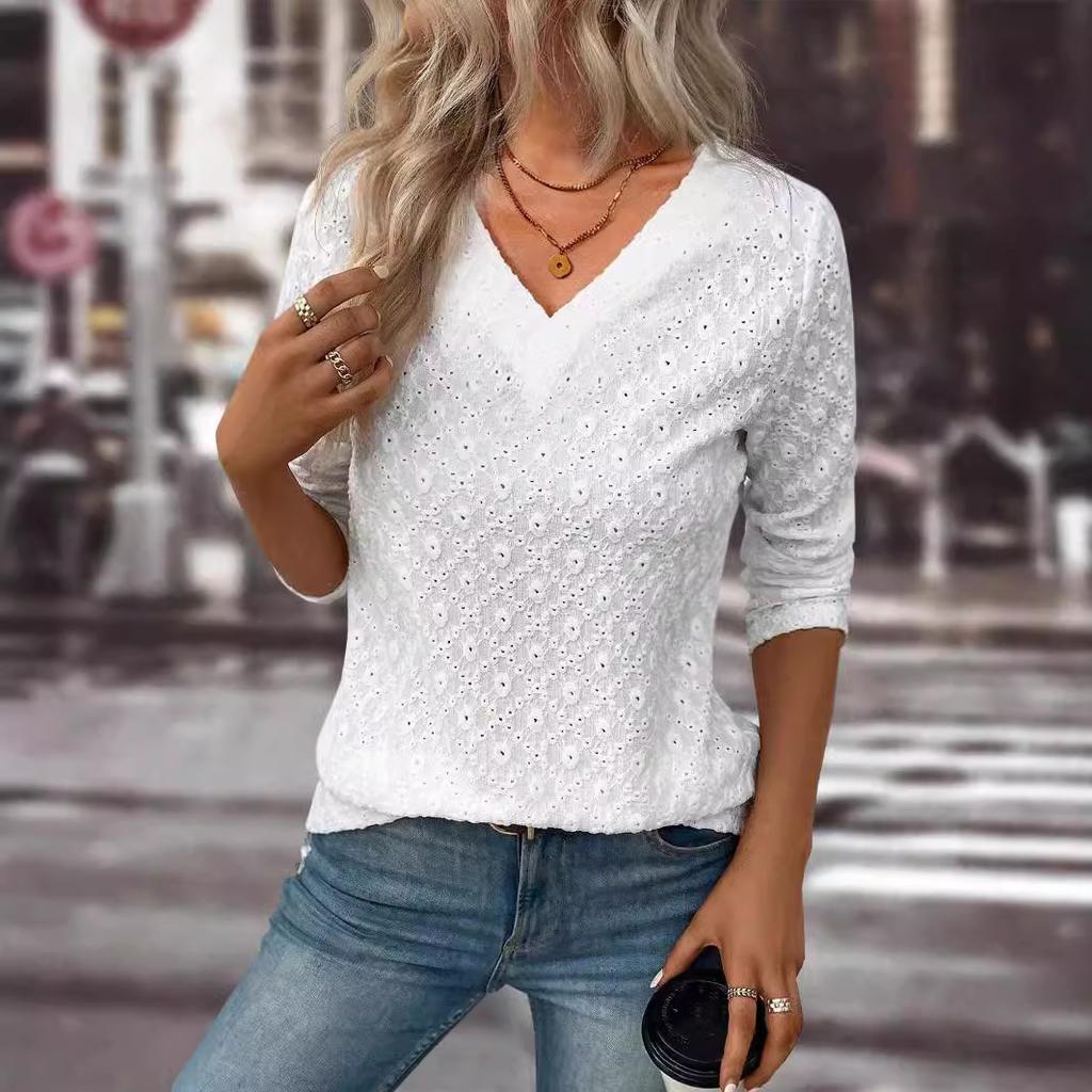 Fashion Ladies Long Sleeve Solid Color Jacquard Breathable Pullover T Shirt Blouse Top
