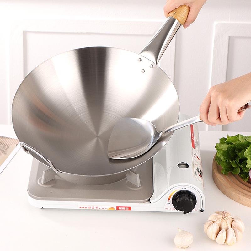 "Double-Ear Stainless Steel Frying Pan - Large, Round Bottom, Single Handle, Ideal for Household and Restaurant Gas Stove Use"