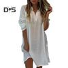 Lady Beach Shirt Dress with Cufflinks Thin Loose Side Slit Midi Dress Turn-down Collar Long Sleeve Dress for Vacation Daily Wear
