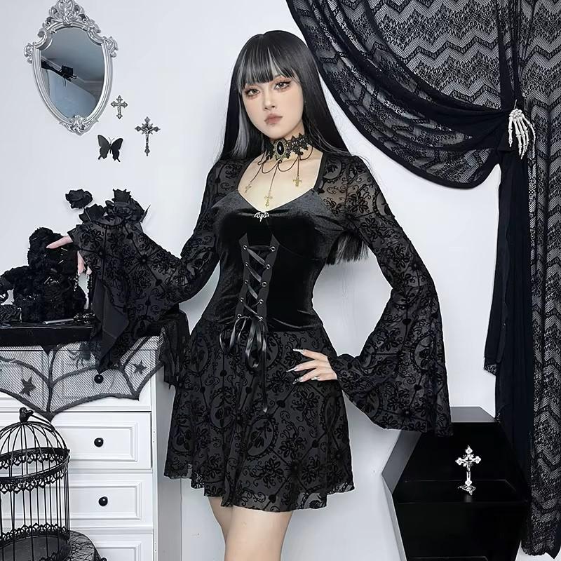 Gothic Goth Dark Elegant Vintage Velvet Dress Grunge Punk Bandage Women Flare Sleeve Party Outfit