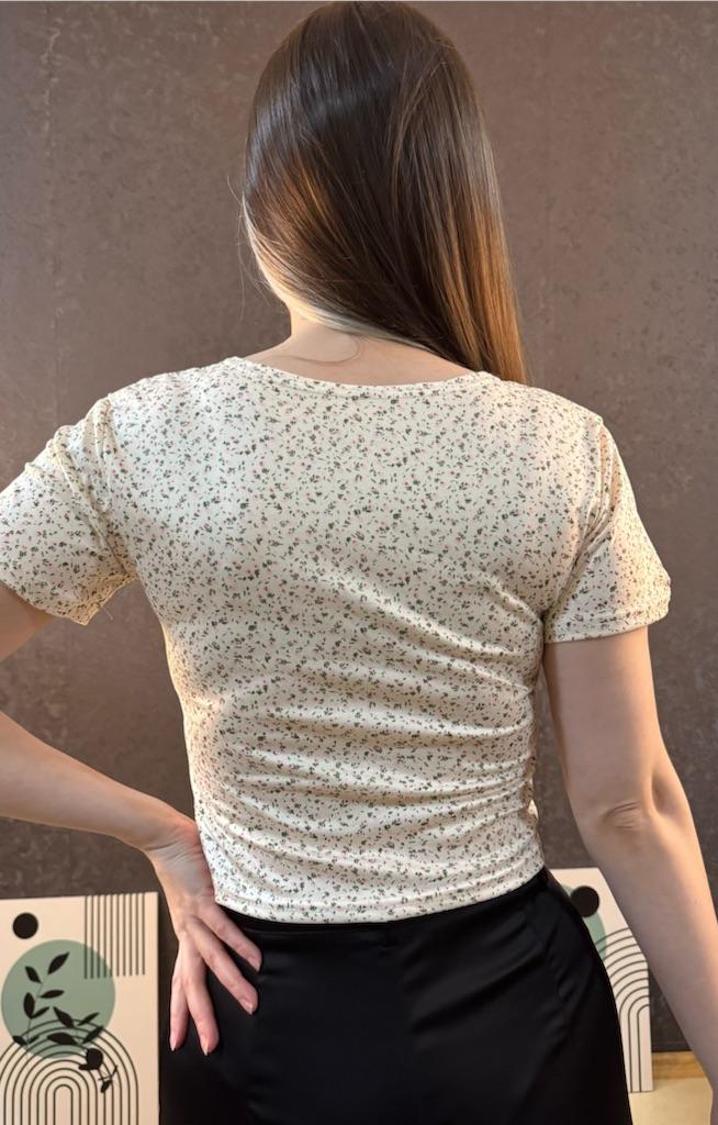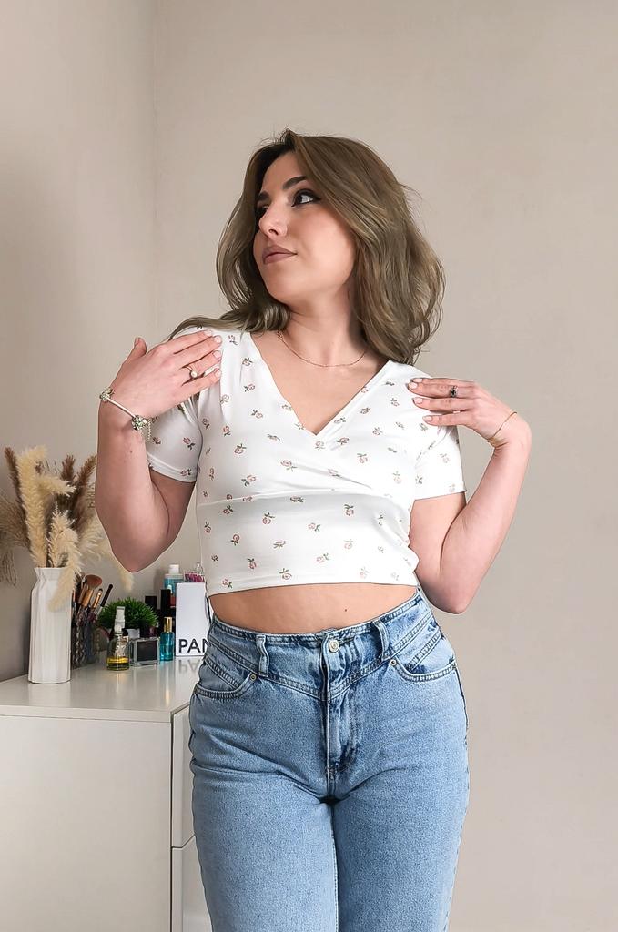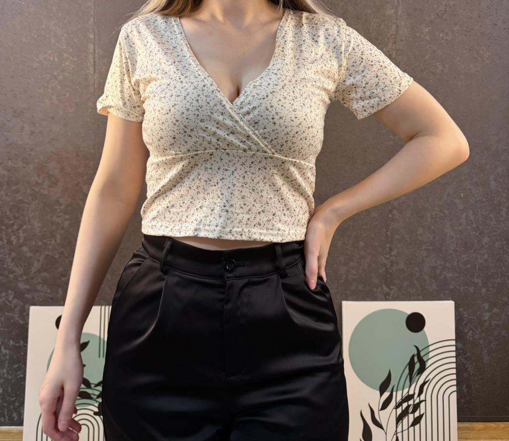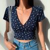 Floral Cross V-Neck Slim Fit Short Sleeved T-Shirt With Exposed Navel, Women's Top