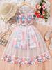 Girls Fashion Dress Summer Kids Cute Cartoon Print Shorts Lined with Suspenders Patchwork Mesh Dress