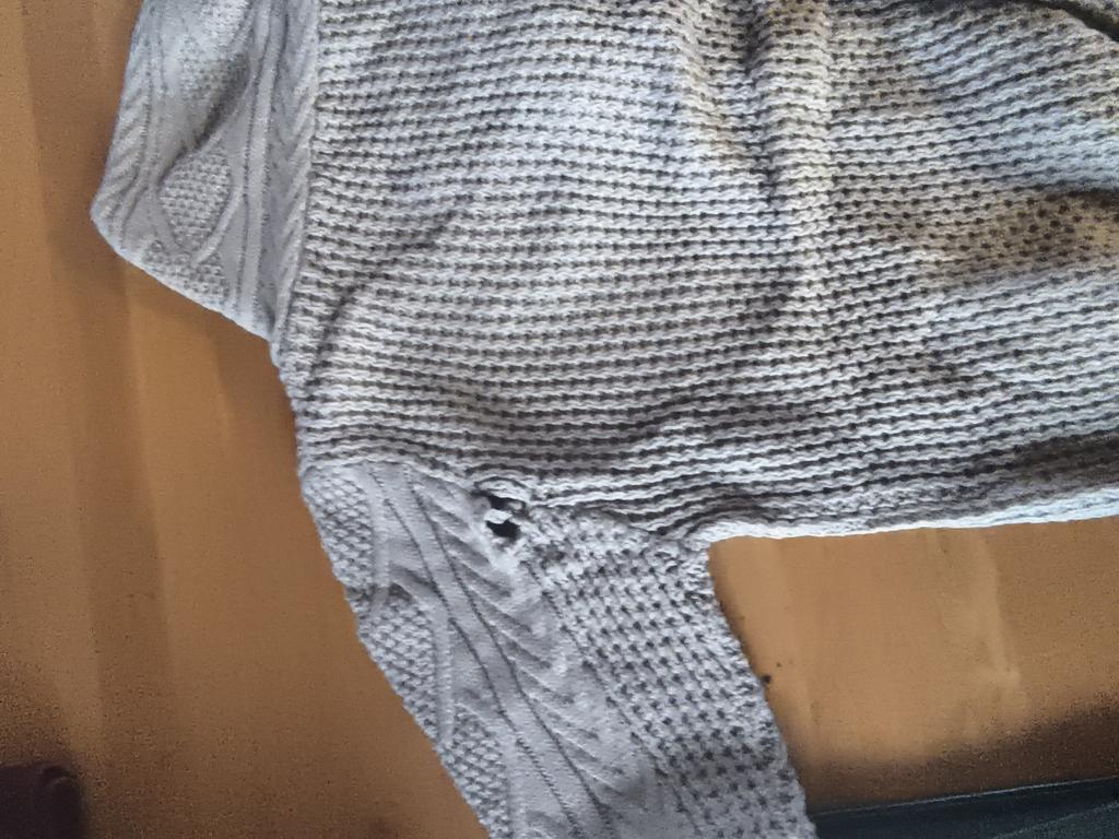 Doesn't match the photo at all. On the photo a thick sweater. Large frayed hole in the back of the sweater. Wasted money