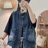 Fashionable Contrast Color Embellished Denim Waistcoat, Large Pockets, Comfortable, Loose, Thin, Meat-covering Vest, Spring and Autumn Jacket