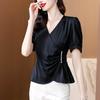 New Summer Small-flavored Beaded Short V-neck Short-sleeved Chiffon Shirt for Women
