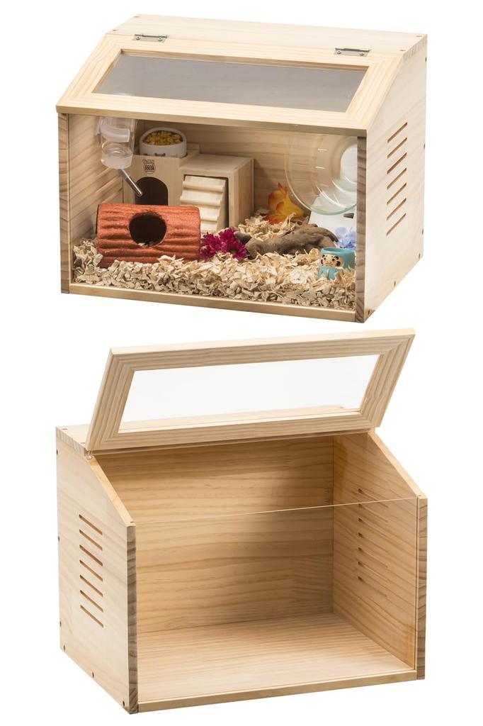 Zabuuun!'s small animal/reptile pet cage is made of solid wood that is warm in winter and cool in summer, allowing you to keep your precious pets safe, secure, and comfortable. You can choose from 3 sizes according to the size of your pet. The front is made of removable transparent acrylic, and both sides are covered with wood with ventilation holes. The top surface is folded back, making it easy to add food, change the appearance, and dispose of feces.