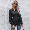 Fashionable and Casual Temperament Vintage Waist Slim Top Black Long Sleeve Lapel Solid Color Shirt for Women