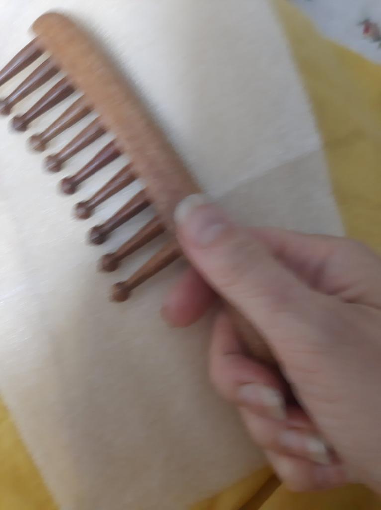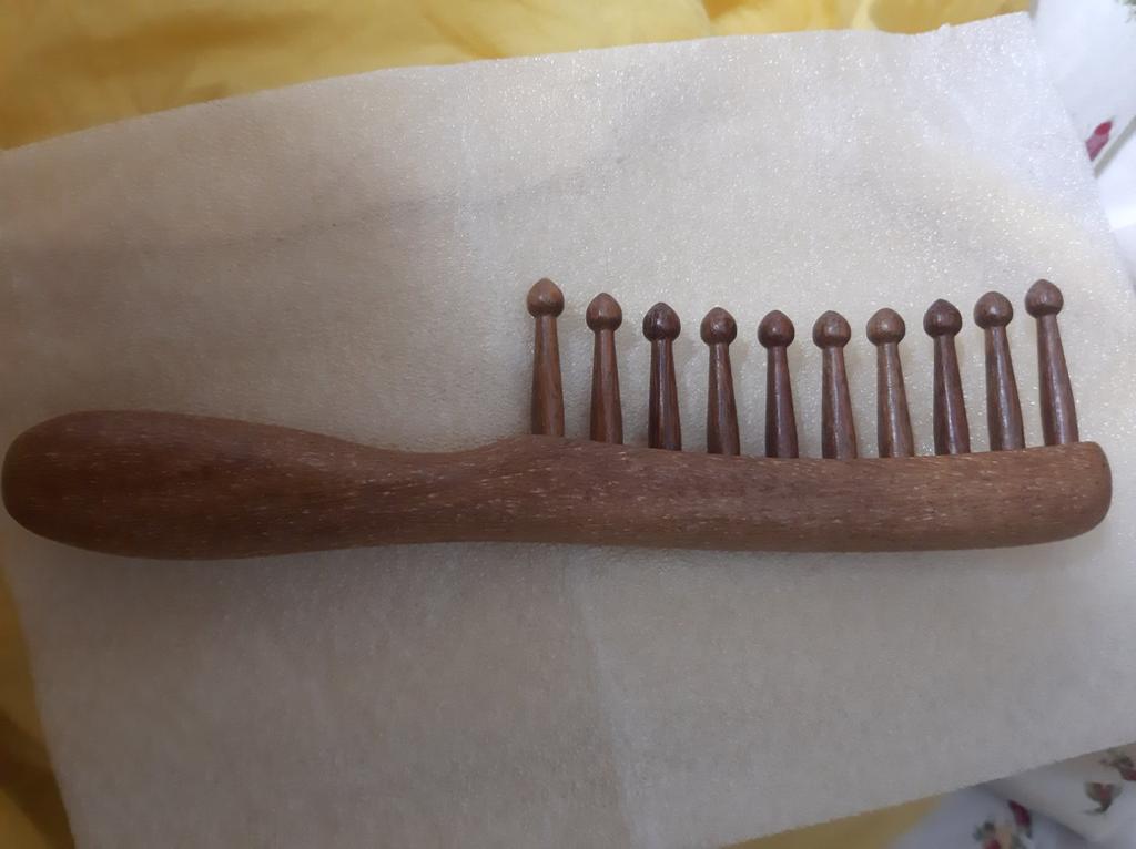 Woody scent... Not very heavy, and not very big... comparing with other wooden sandalwood combs... comfortable to hold in the hand.