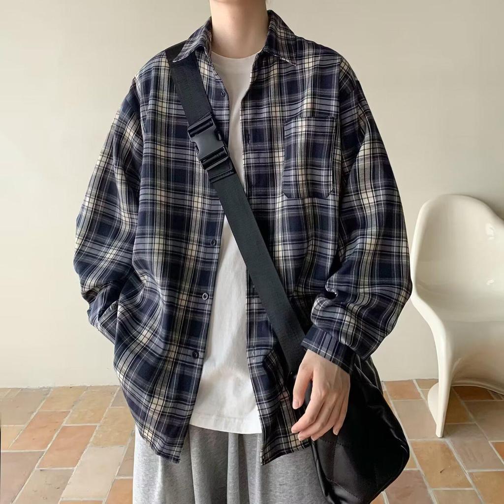 Men's Hong Kong-Style Plaid Shirt: Trendy Japanese Long-Sleeve for Spring & Autumn