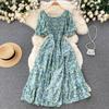 Women's Chic Sweet Slim Square Neck Bubble Sleeve Floral Dress Super Fairy Temperament A-line Dress