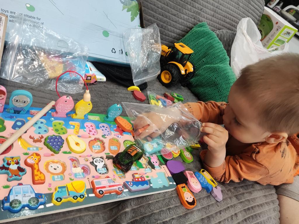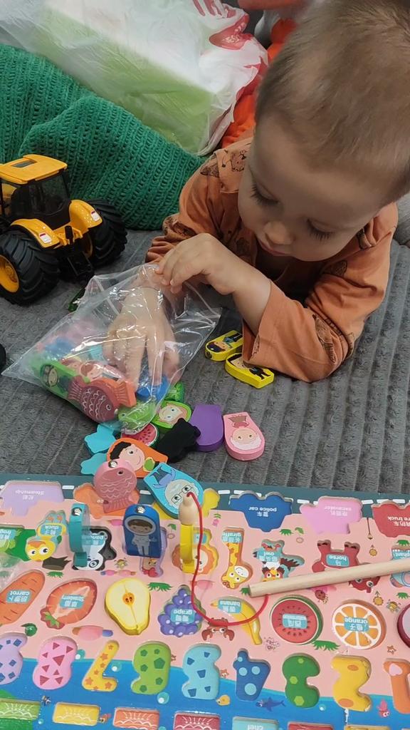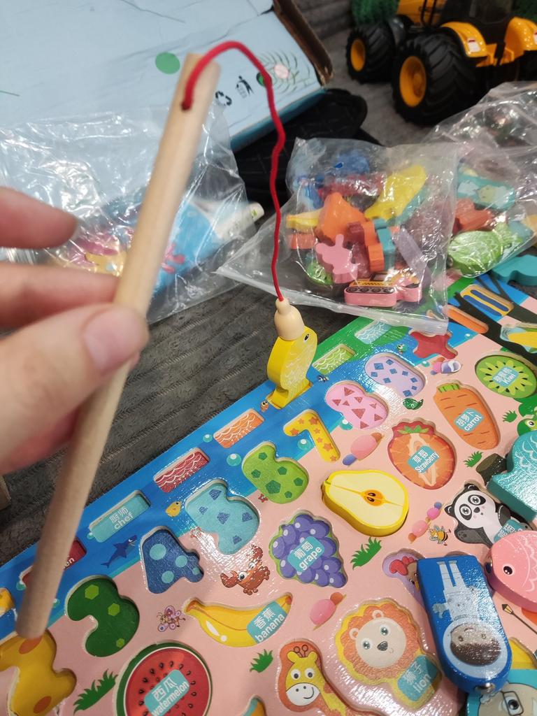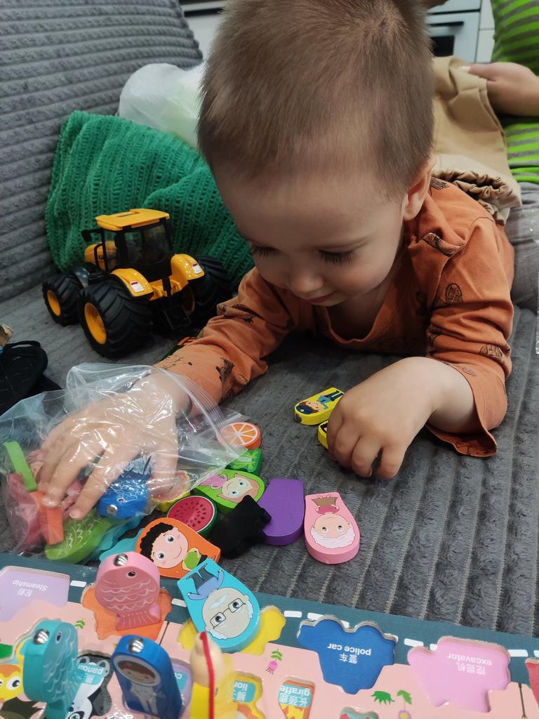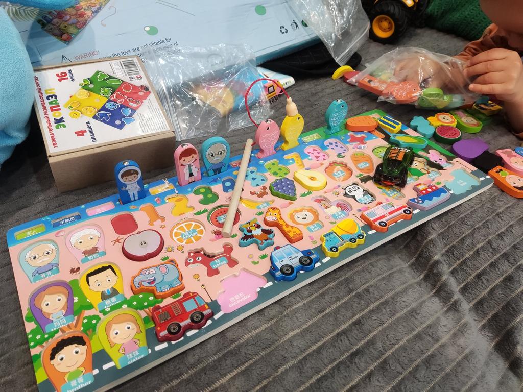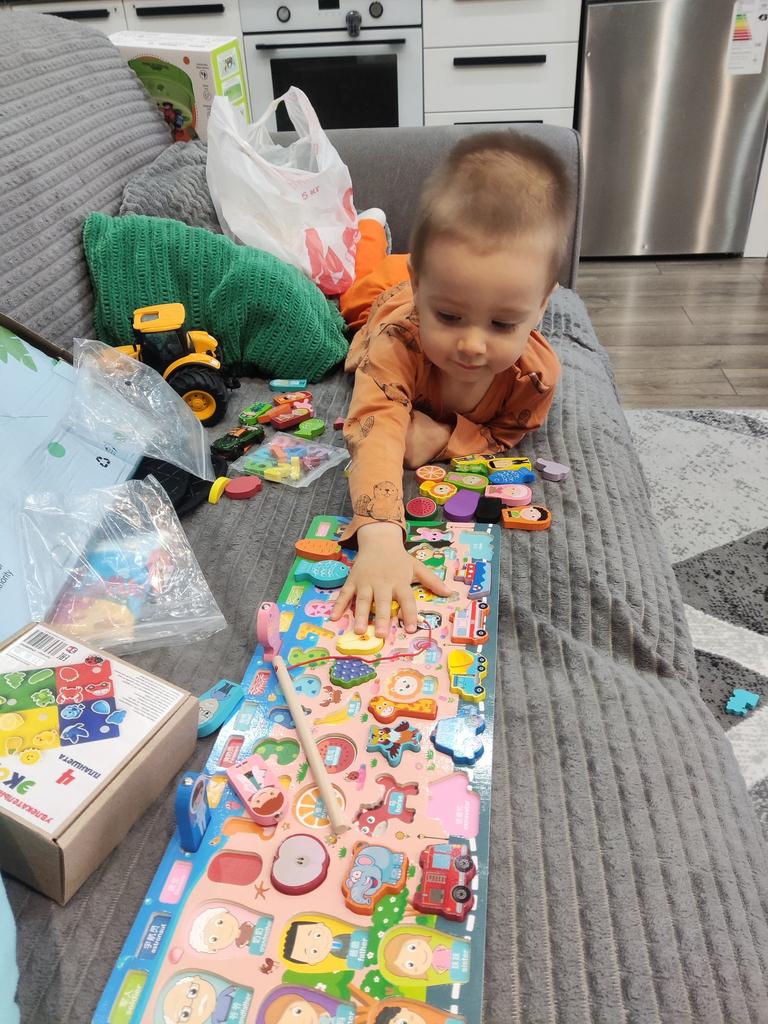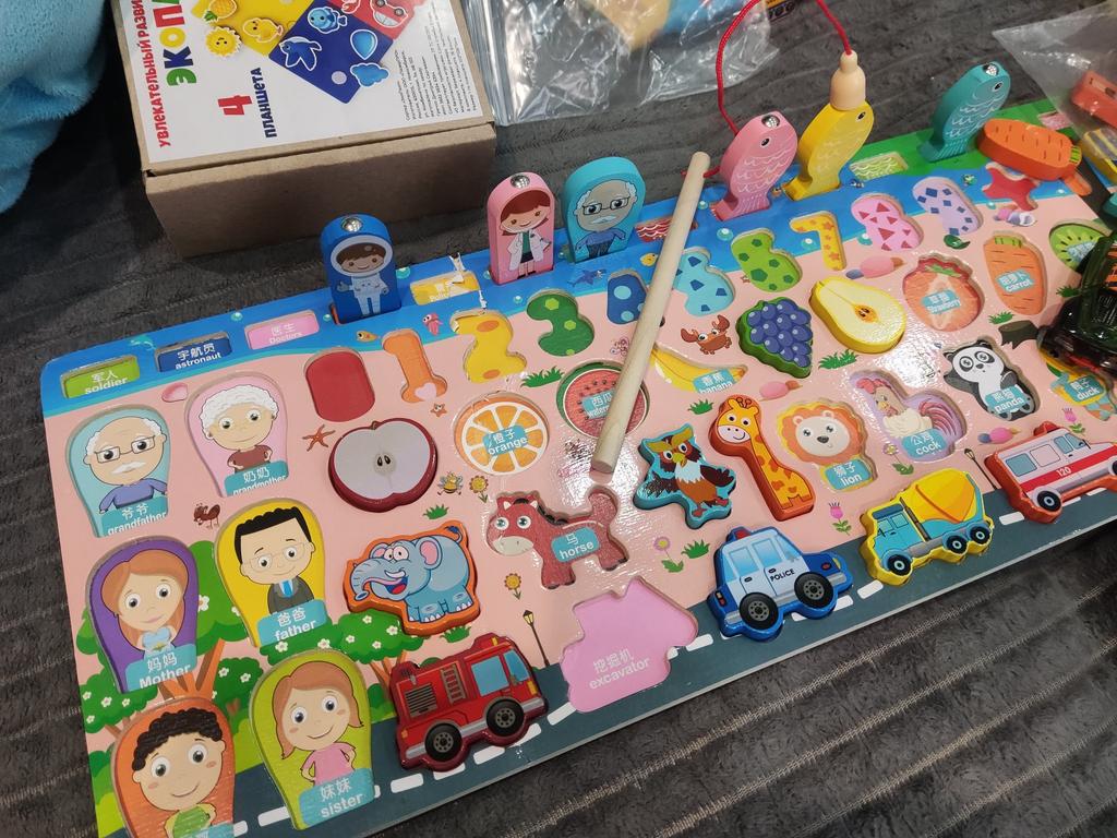 Large interesting game for toddlers made of thick cardboard The bright, interesting game is a large board with figures and recesses of the same shape as the figures. Some pieces have magnets; there is a special "fishing rod" with a metal tip for them. You can sort the figures into their "nests" with the baby, while saying their names.. A game for developing speech, thinking, and motor skills. Figures on various themes - animals, professions, numbers, transport. The game is bright and interesting, but poorly packaged, so mine arrived with damage - visible in the last photo.
