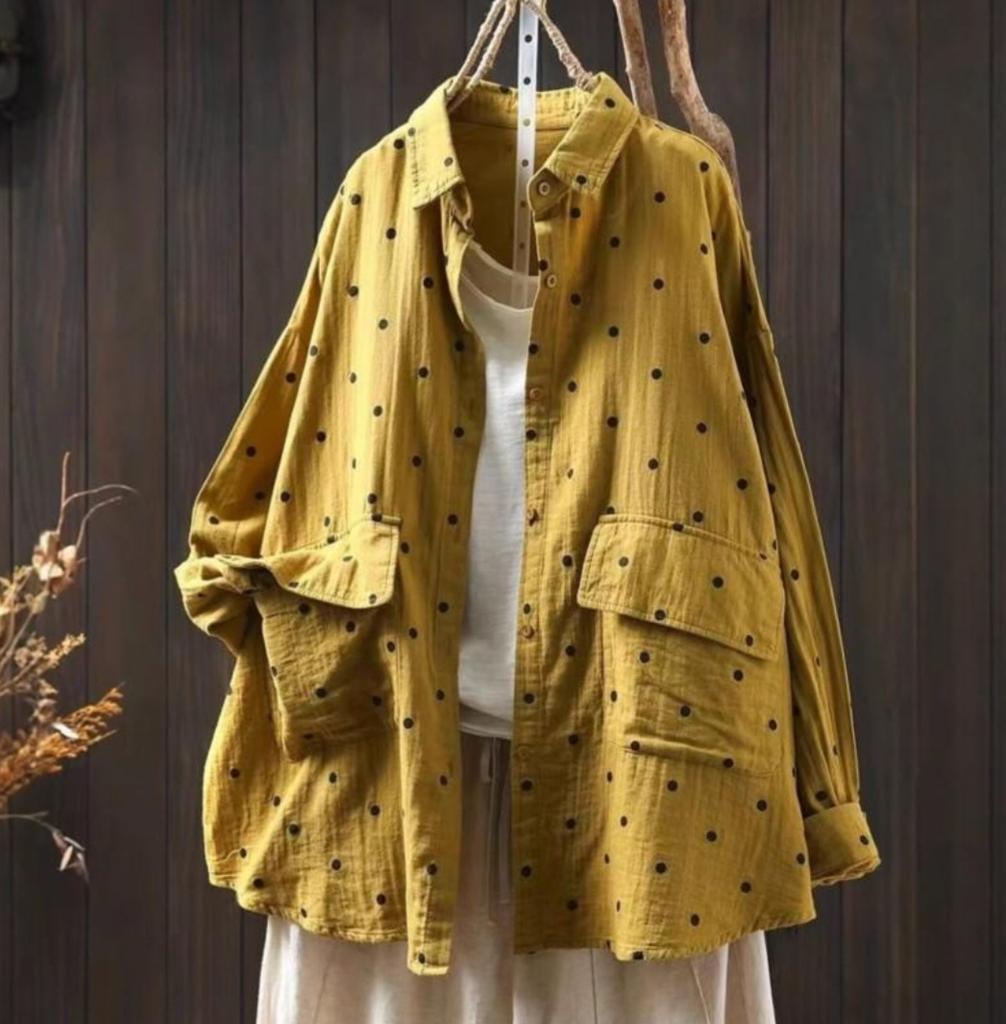 Johnature Women Polka Dot Shirts Tops Turn-down Collar Blouses Spring Button Long Sleeve Pockets Women Shirts