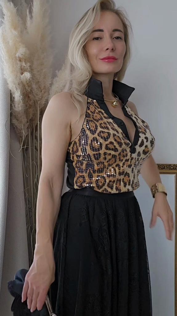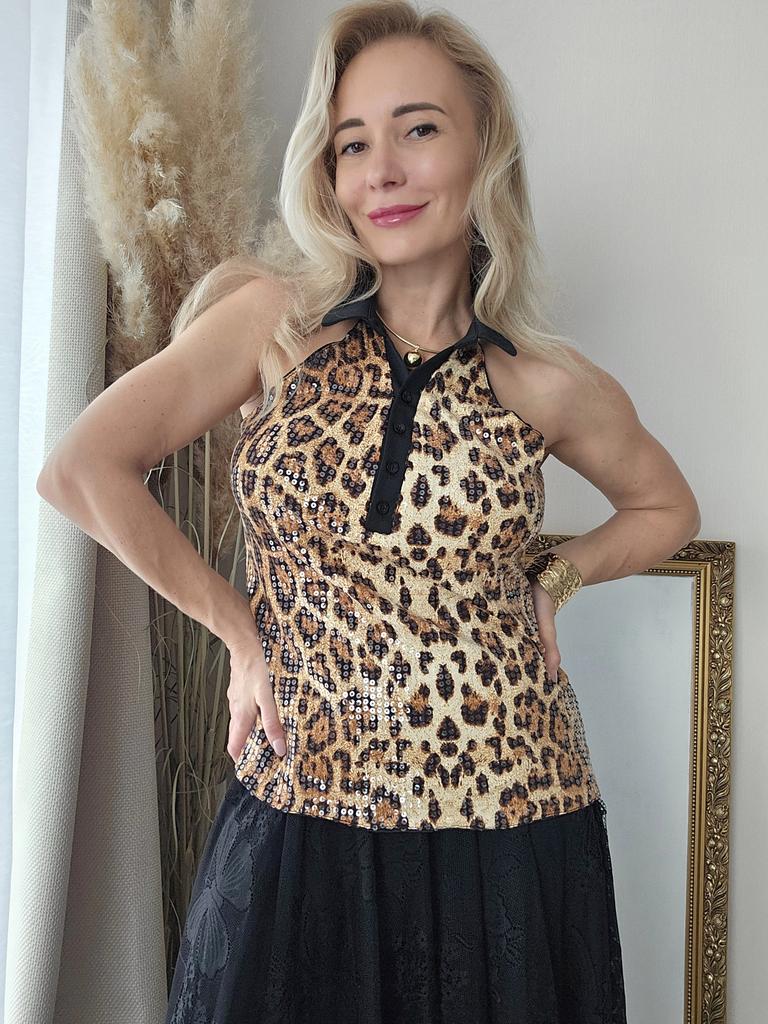 Beige Leopard Print Sequin Slim Fit Vest Summer 2025 Cross-Border Hanging Neck Collar Women's Top Polyester Fiber Blend