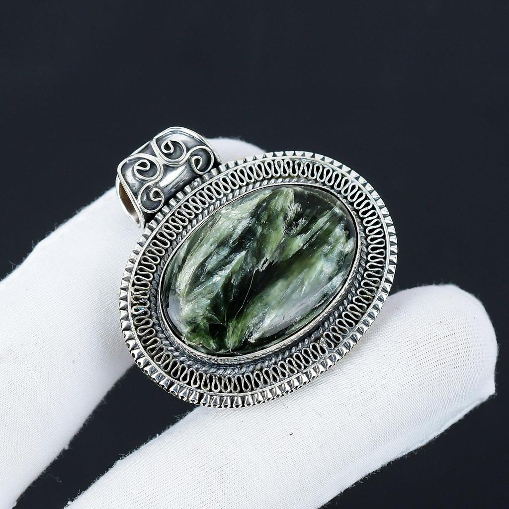 Natural Seraphinite Gemstone Silver Pendant In 925 Sterling Silver- Handmade Design, Everyday Wear Jewelry, Antique Pendant Gifts For Her