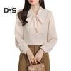 Women Shirt Lace-up Bowknot Collar Long Sleeve Casual Shirt Solid Color Loose Fit Chiffon Shirt Tops Daily Wear