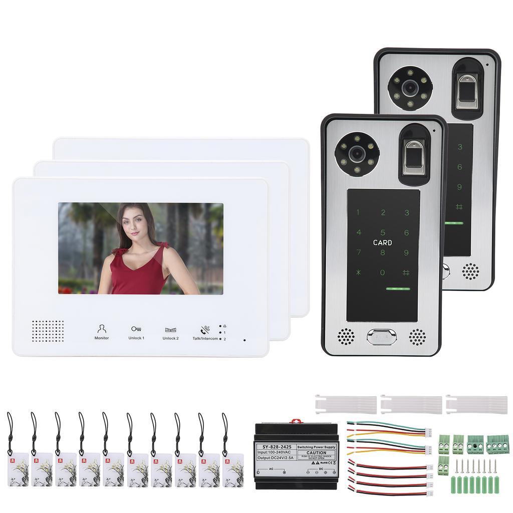 2 x Outdoor Camera3 x Indoor Monitor1 x DC24V 2.5A Power Supply10 x IC Card2 x 4 Core Connection Lock Terminal Wire4 x 2 Core Connecting Terminal Wire1 x Screw Pack3 x Bracket3 x 2 Hole Terminal1 x 3 Hole Terminal1 x 4 Hole Terminal1 x User Manual