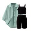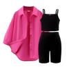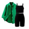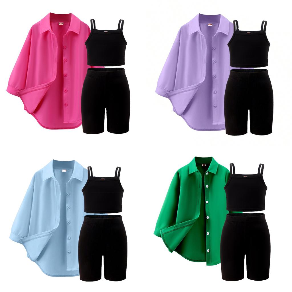 Girls' Leisure Suit Spring and Autumn Children's Solid Color Suspenders + Quarter Pants + Long Sleeve Jacket Three-piece Set