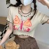 Design Sense Spicy Girl Printed Fungus Edge Exposed Navel Knitted Short Sleeved T-shirt for Women's Summer Versatile Clothes
