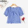 VONDA Women Summer Square Collar Short Puff Sleeve Bow Knot Plaid Print Casual T-shirts