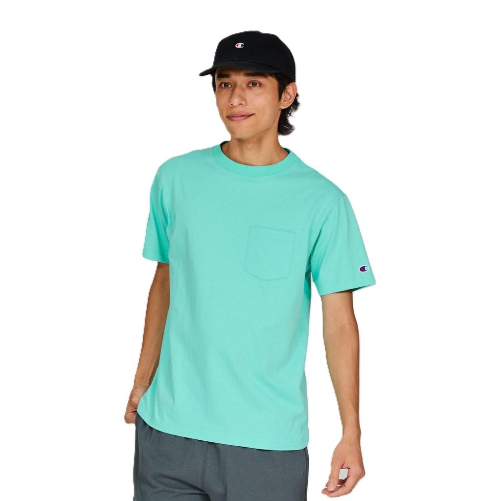Short Sleeve Round Neck Cotton USA Short Sleeve Pocket Basic Light Blue Green [Champion] T-Shirt 100% T-Shirt C3-X357 Men's