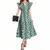 Women's V-neck Pleated Flying Sleeves Printed Mid-length Dress