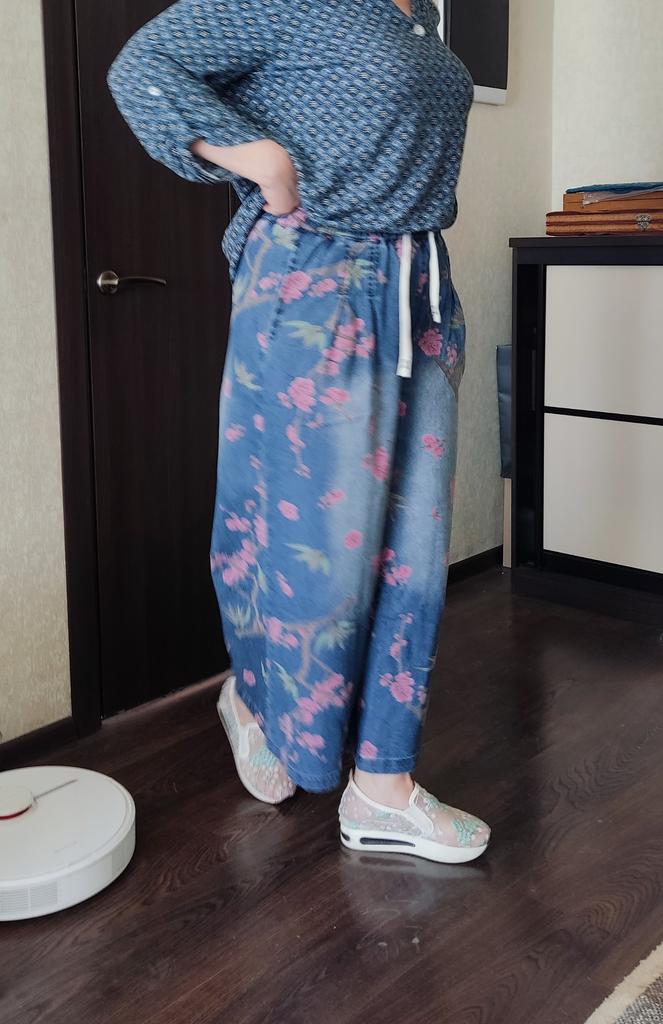 DIMANAF 2025 Summer Plus Size Jeans Long Pants Women Casual High Waist Elastic Basic Loose Floral Wide Leg Pants