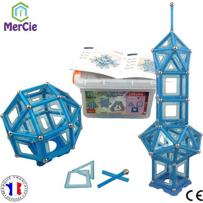 Blocs construction magnétiques| 146 pcs: bâtons xl avec aimants puissants, billes acier solidaires, tuiles et socle + boite rangemen