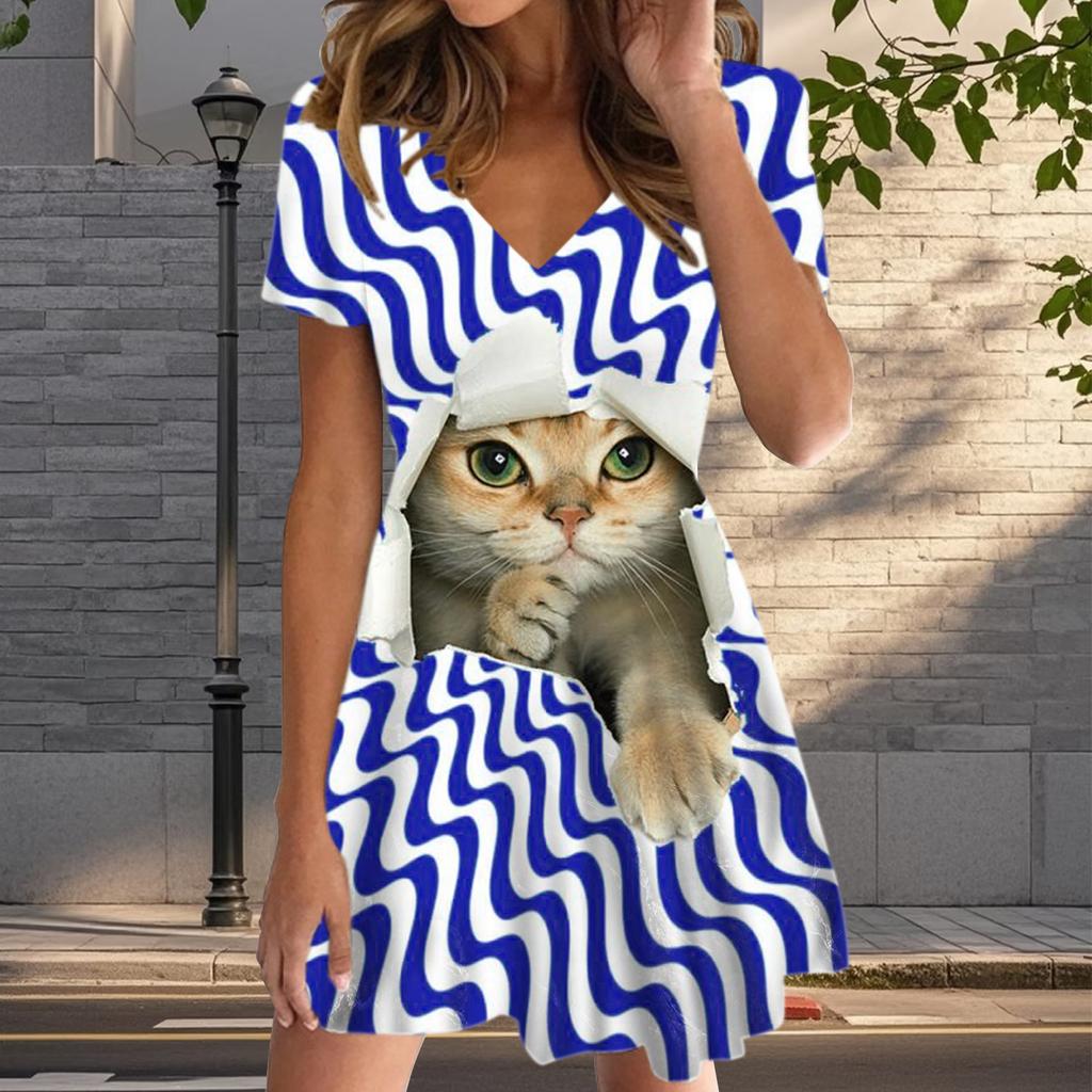 Summer Fashion Women's V Neck Short Sleeve Cute Cat Printed Dress Sex Short Skirt Dresses