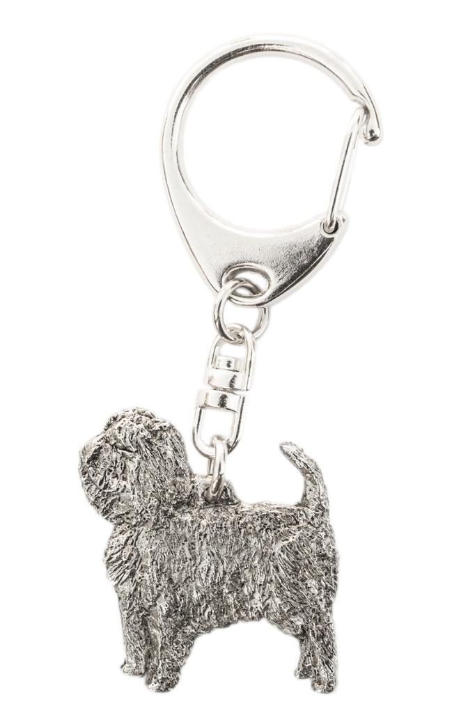 This is an elaborate and antique-looking metal (alloy, antique silver finish) dog key chain made by Alden Arts, a British manufacturer with over 50 years of history and tradition.