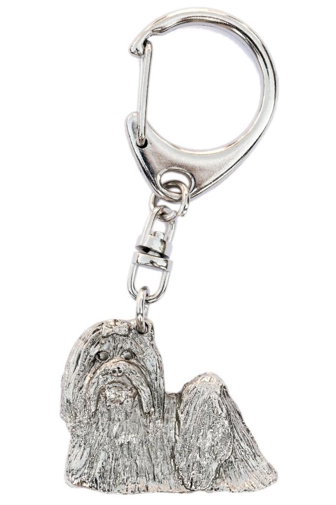 This is an elaborate and antique-looking metal (alloy, antique silver finish) dog key chain made by Alden Arts, a British manufacturer with over 50 years of history and tradition.