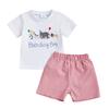 Toddler Boy Birthday Clothes Letter Animal Print Short Sleeves Round Neck Tops with Plaid Shorts 2 Pcs Outfit