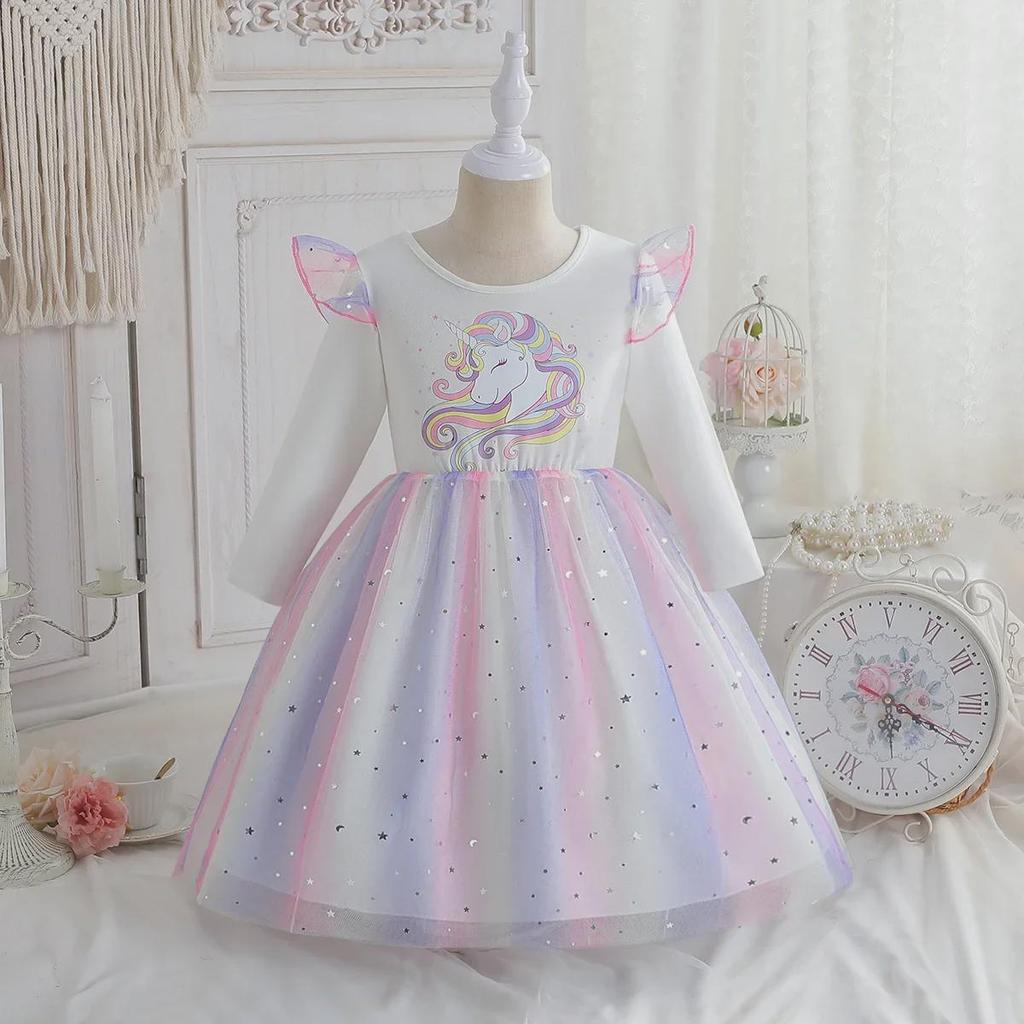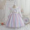 This enchanting dress is perfect for your little one's special occasions. Designed for spring and autumn celebrations, it features a delightful long sleeve design crafted from chiffon material. The dress is adorned with a magical unicorn and rainbow motif, enhanced by sparkling sequined mesh that adds a touch of whimsical charm. Ideal for birthdays, this dress will make any girl feel like a true princess.