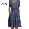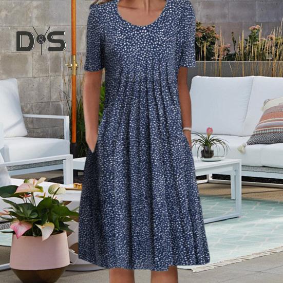 Women's Floral Print Tunic Shirt Dress Short Sleeve Crew Neck Pleated Midi Dress with Pockets Summer Boho Swing Sundress