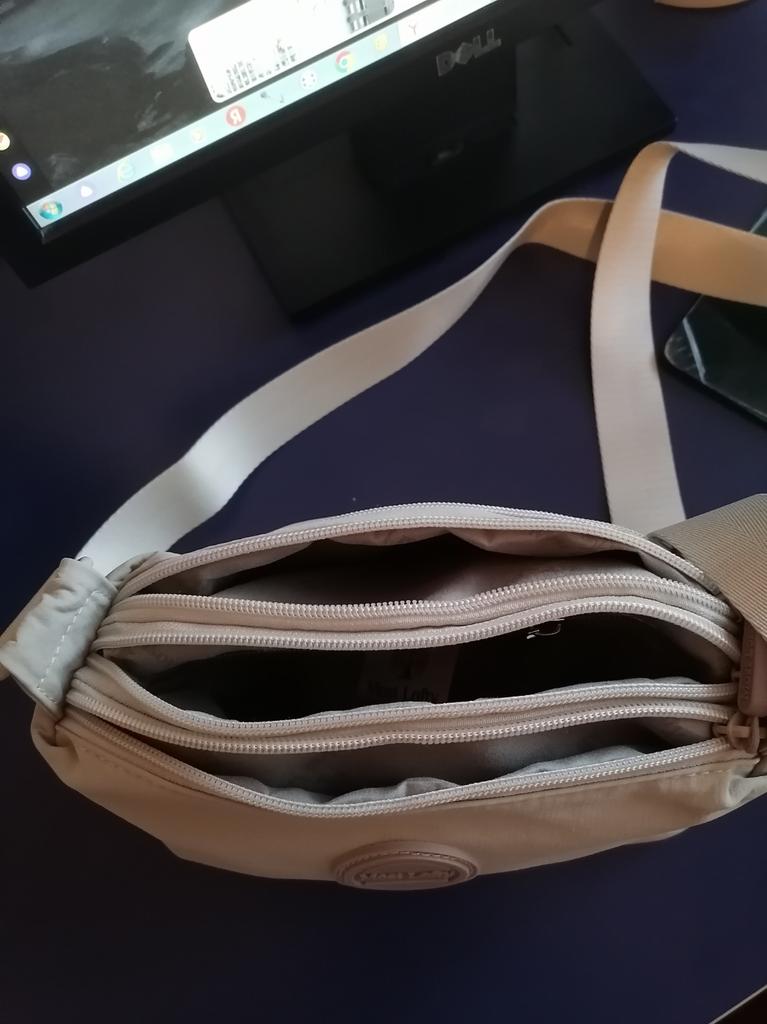 Wonderful nylon handbag, three compartments, a small pocket inside the middle compartment, and a pocket on the back of the handbag. Sewn qualitatively, there is no foreign smell. Very light and neat.
