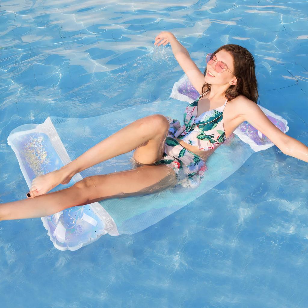 [Easy-saving water hammock] There are only two openings to let air in, so the amount of air you put in is small, and it's easy to put in and take out air. With thicker PVC material and better sealing, the float is durable and not easy to tear. The vinyl is thick and durable, and the stitching is careful. After deflating, it can be folded into a compact size, making it easy to carry and suitable for travel. It also doesn't get in the way and can be stored in a small space.