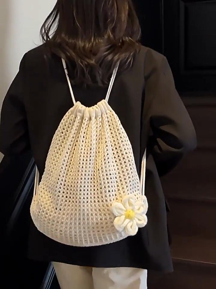 Yogodlns Fashion Solid Color Floral Decor Crochet Shoulder Bag Woven Women Beach Holiday Bucket Hollow Out Large Capacity Backpack