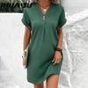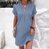 IHUASU Summer Women Dress V Neck Button Short Sleeve Loose Solid Pullover Casual Daily Wear Mini Dress
