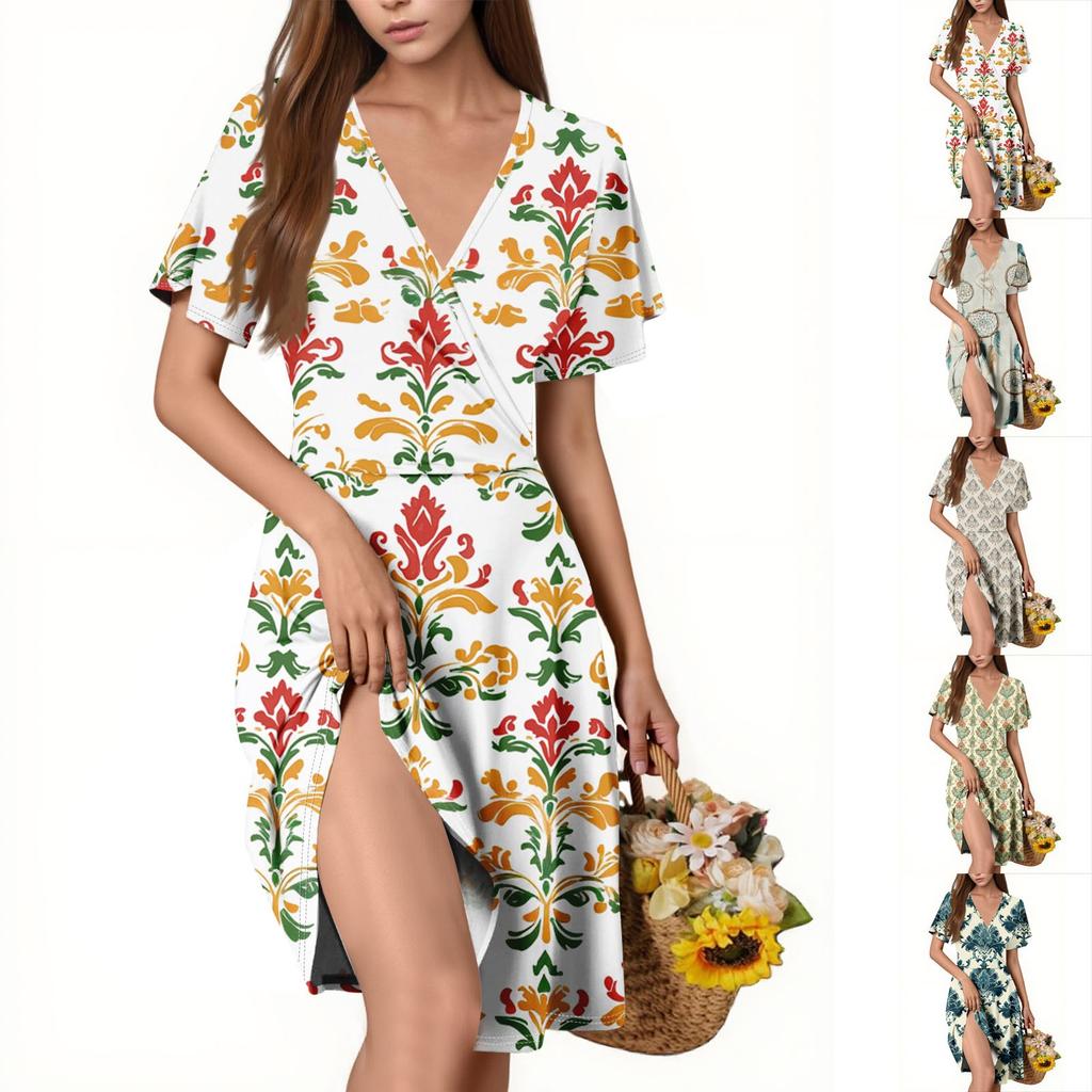 Ladies Casual Fashion V-Neck Short Sleeve Printed Dress