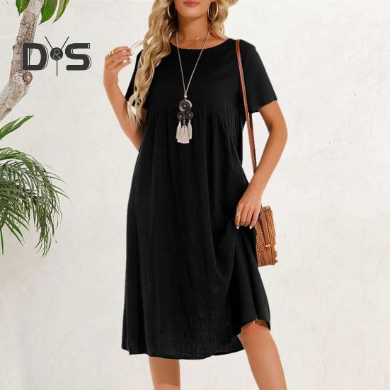 Women Dress Round Neck Short Sleeve Knee-Length Solid Color Dress with Pockets Loose Fit Summer Dress