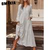 GMXIA Women's Cotton Maxi Dress Long Sleeve Ruffle Pocket V Neck